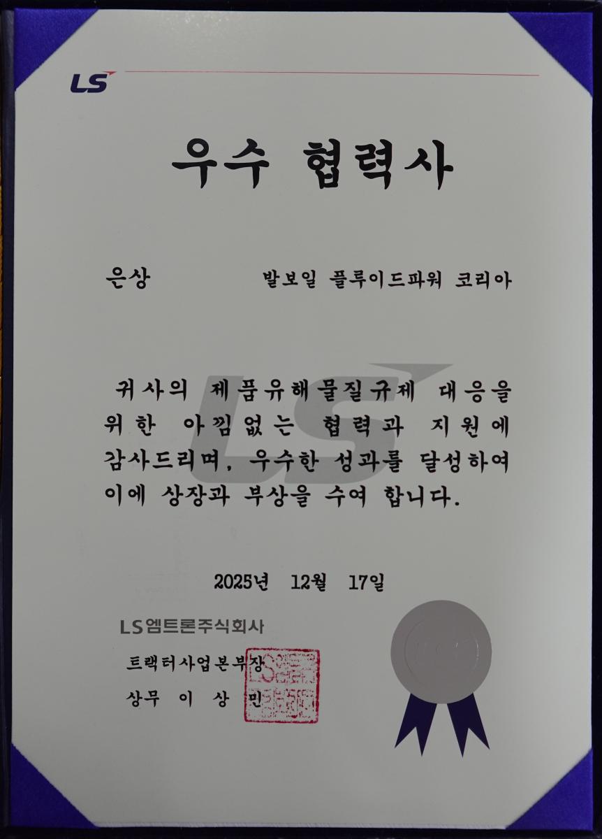 발보일플루이드파워코리아는 LS엠트론으로부터 ‘우수 협력사 은상’을 수상하였습니다.